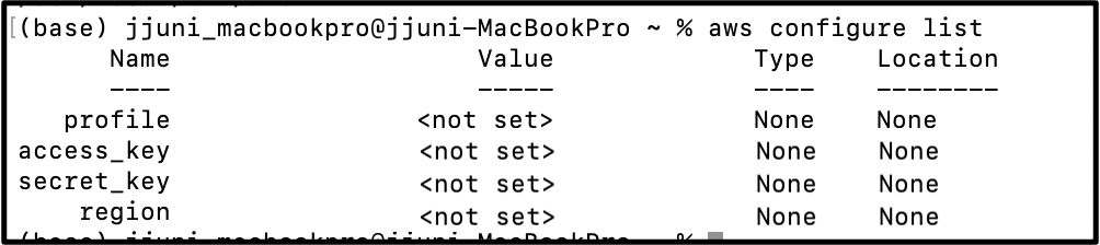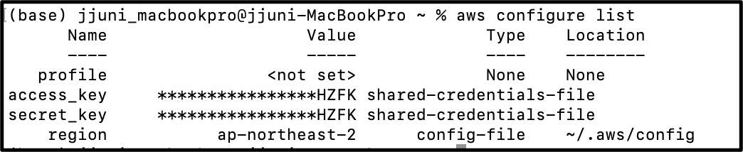 4) $ aws configure list 명령을 통해 제대로 설치되었는지 확인해보자!