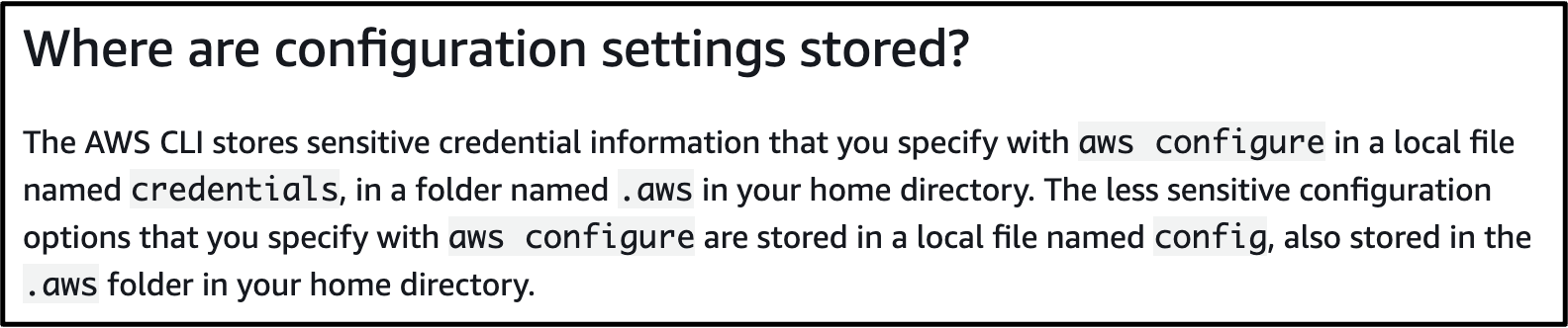 - configure(비교적 덜 민감한 정보) : /.aws 디렉토리에 "config"라는 디렉토리를 만들어서 저장