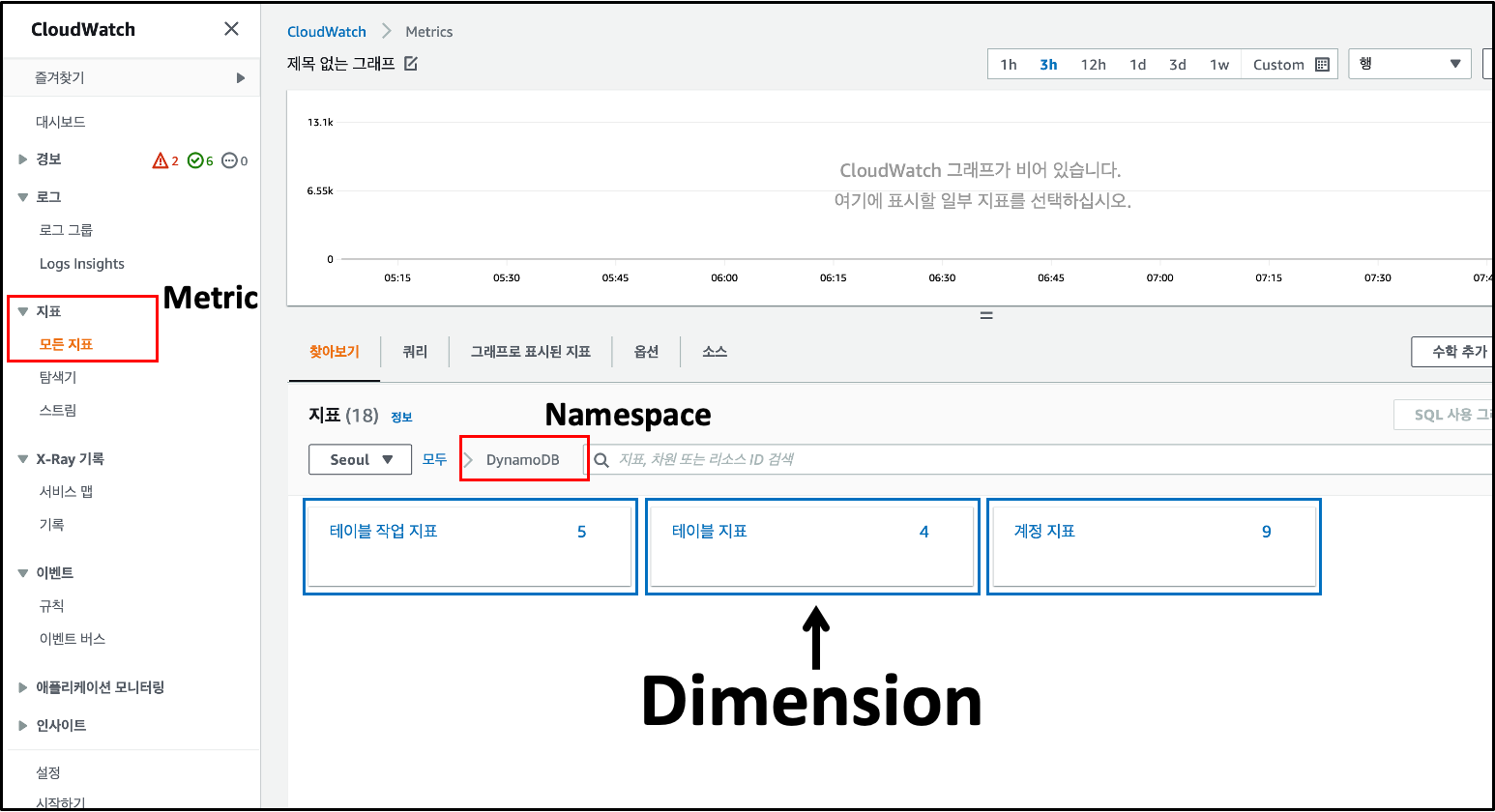이번에는 CloudWatch 콘솔창에서 확인해보겠습니다. 좌측에 메뉴의 지표는 Metric, DynamoDB는 Namespace입니다.