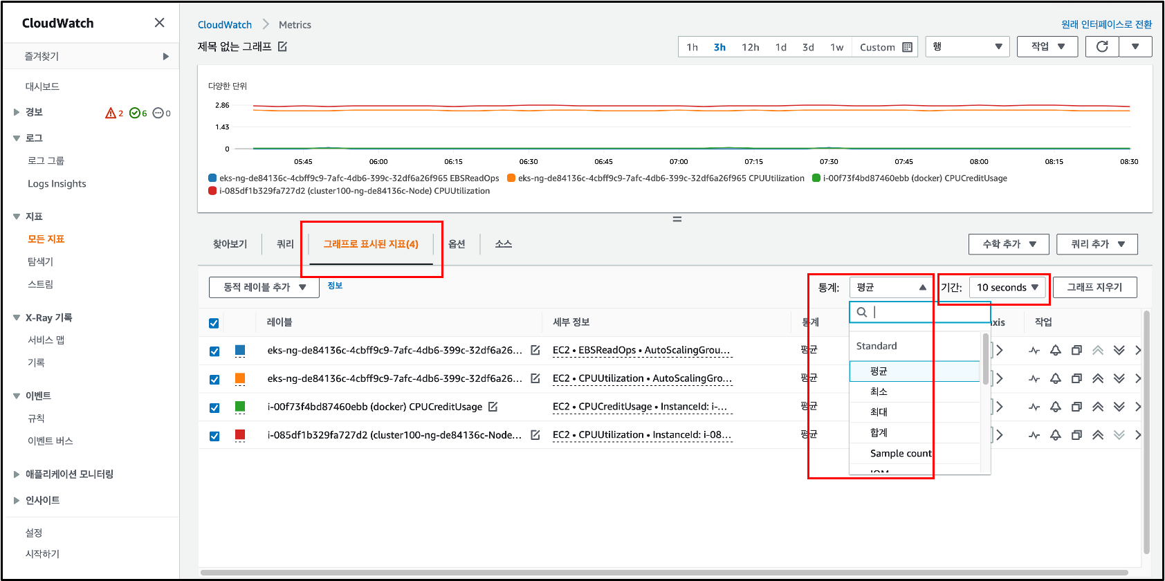 Dimension을 선택하고 나면 Metric을 선택할 수 있고 Metric 그래프를 확인할 수 있습니다. 이 때, AWS에서 발생된 이벤트들에 대한 지표를 평균, 최소, 최대, 합계 등으로 확인할 수 있습니다. 이러한 통계 값을 Statics라고 합니다. 이때, 1초, 5초, 10초, 1시간 등 다양한 시간 단위별로 메트릭을 확인할 수 있는데 이것을 Period라고 합니다.