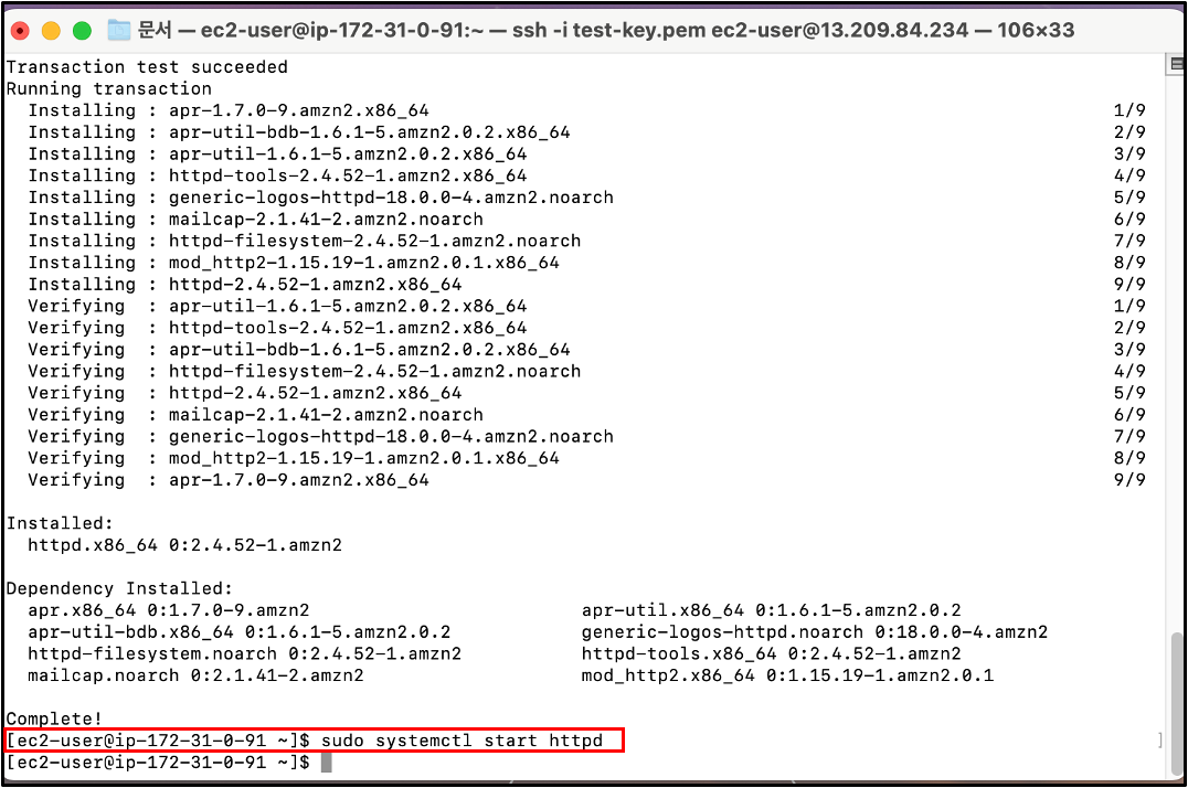 1. 쉘을 통해 아파치 패키지(httpd)를 설치합니다.