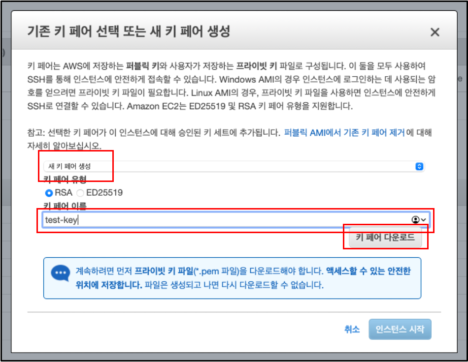 시작하기를 누르면, 다음과 같이 키페어 설정창이 나타납니다!