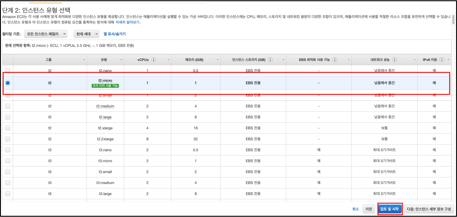 이번에도 역시 프리티어인 t2.micro를 선택해줍니다!
