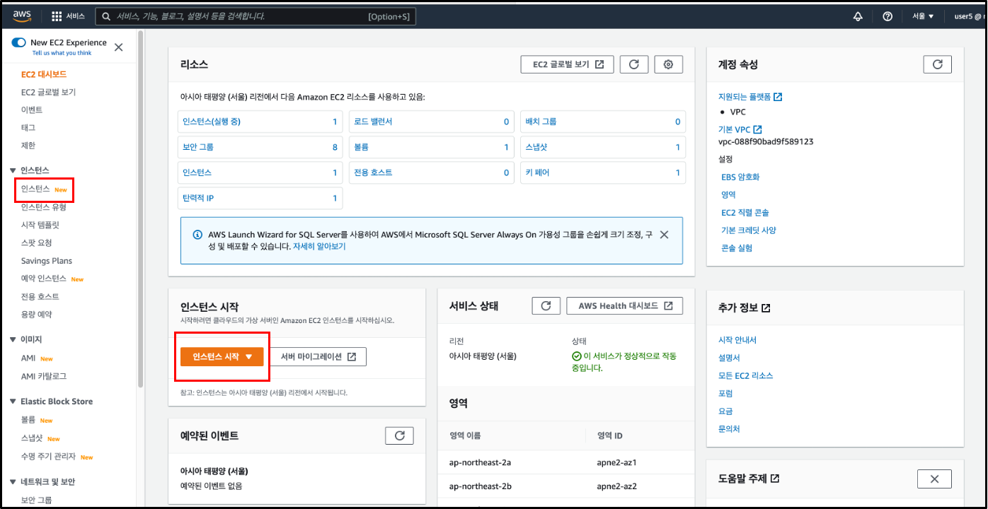1) EC2 대시보드에서 바로 [인스턴스 시작]하기