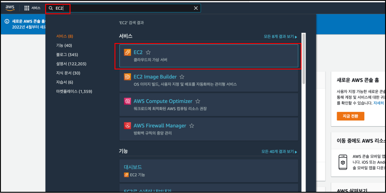 우선, AWS 콘솔에서 EC2 서비스를 검색하여 접속합니다.