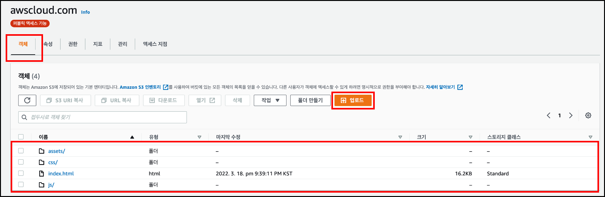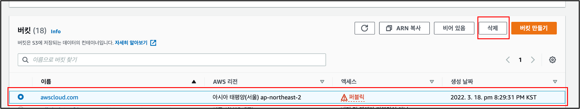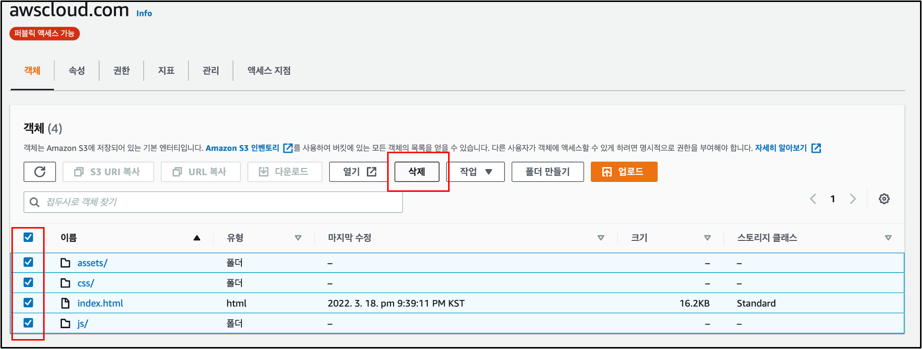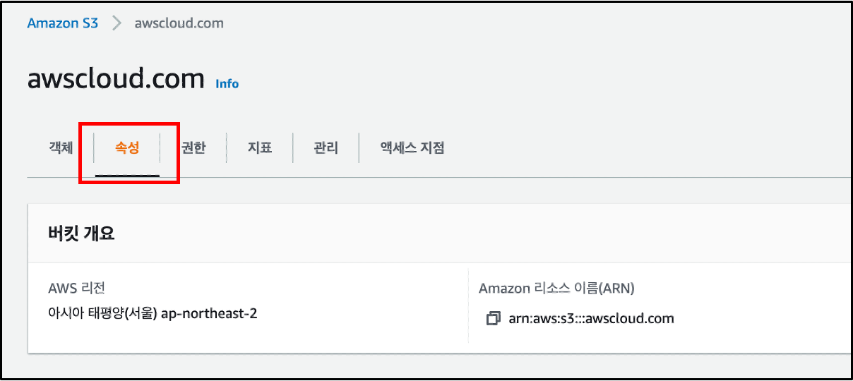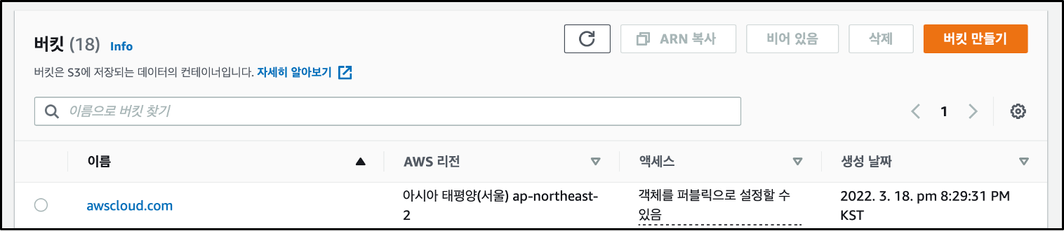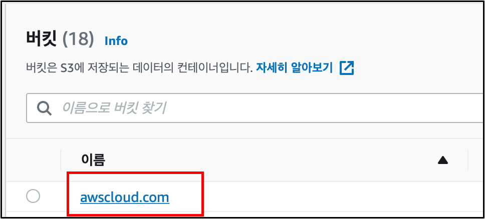방금 만든 [awscloud.com] 이름을 가진 버킷을 선택하여