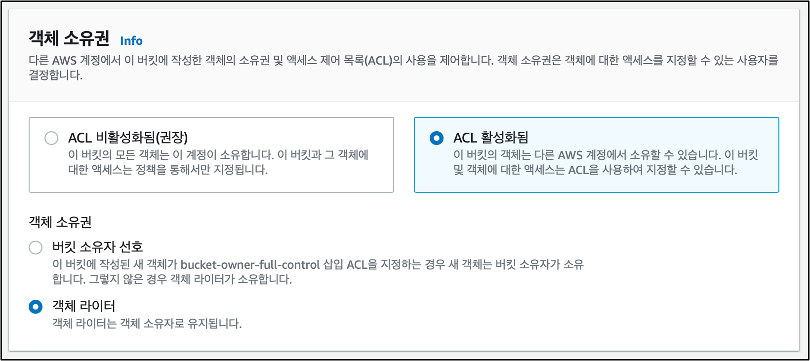 - 버킷 소유자 선호 : 버킷 소유자는 ACL에 대해 bucket-owner-full-control을 가지고 다른 계정이 버킷에 쓰는 새로운 개체를 소유하고 완전히 제어할 수 있습니다.