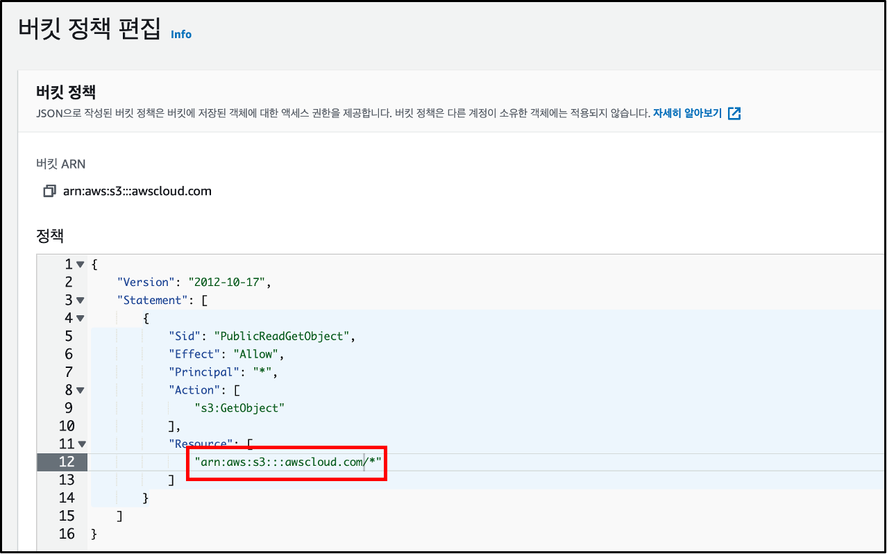 4. 버킷 콘텐츠를 공개적으로 사용 가능하도록 설정하는 버킷 정책 추가