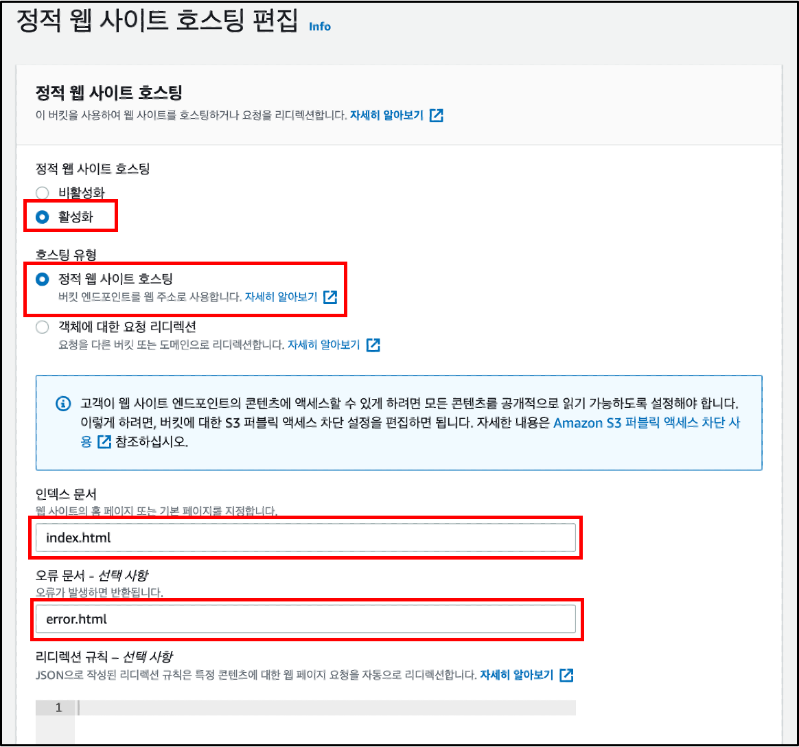 - 호스팅 유형 : 정적 웹사이트 호스팅